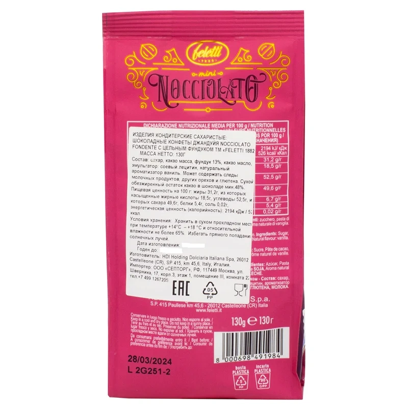 Конфеты Feletti 1882 Mini Nocciolatto Fond с фундуком, 130г