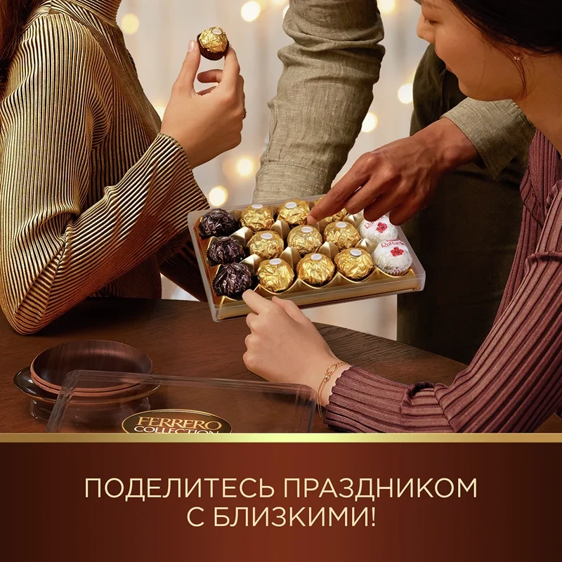 Набор конфет Ferrero Collection: Raffaello, Ferrero Rocher, Ferrero Rondnoir, 172,2 г - это вкусное лакомство с разным наполнителем. В десерте молочный и белый шоколад удачно сочетается с различными орехами. Конфеты просто тают во рту, гарантируя удовольствие от дегустации или чаепития. Каждая конфета обернута цветной фольгой, что обеспечивает эстетичный и привлекательный вид сладостей. Набор упакован в презентабельную коробку, за счет чего становится презентабельным и желанным комплиментом для близких людей.