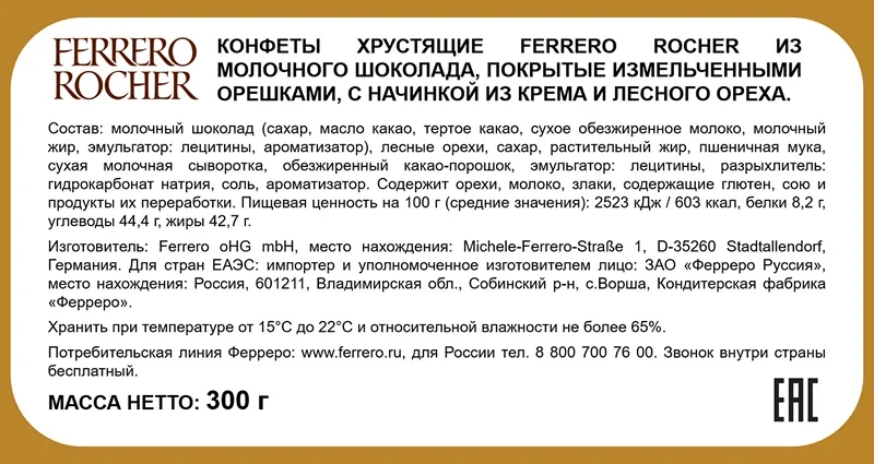 Ferrero Rocher - молочный шоколад 30,2% (сахар, какао-масло, тертое какао, сухое обезжиренное молоко, молочный жир, эмульгатор (соевый лецитин), ванилин), лесные орехи 28,8%, сахар, растительное масло, пшеничная мука, сухая молочная сыворотка, обезжиренный какао-порошок, разрыхлитель (гидрокарбонат натрия), соль. Общий сухой остаток какао-продуктов: не менее 25%, сухой обезжиренный остаток какао-продуктов: не менее 2,5%, сухие вещества молока: не менее 14%, молочный жир: не менее 3,5%.