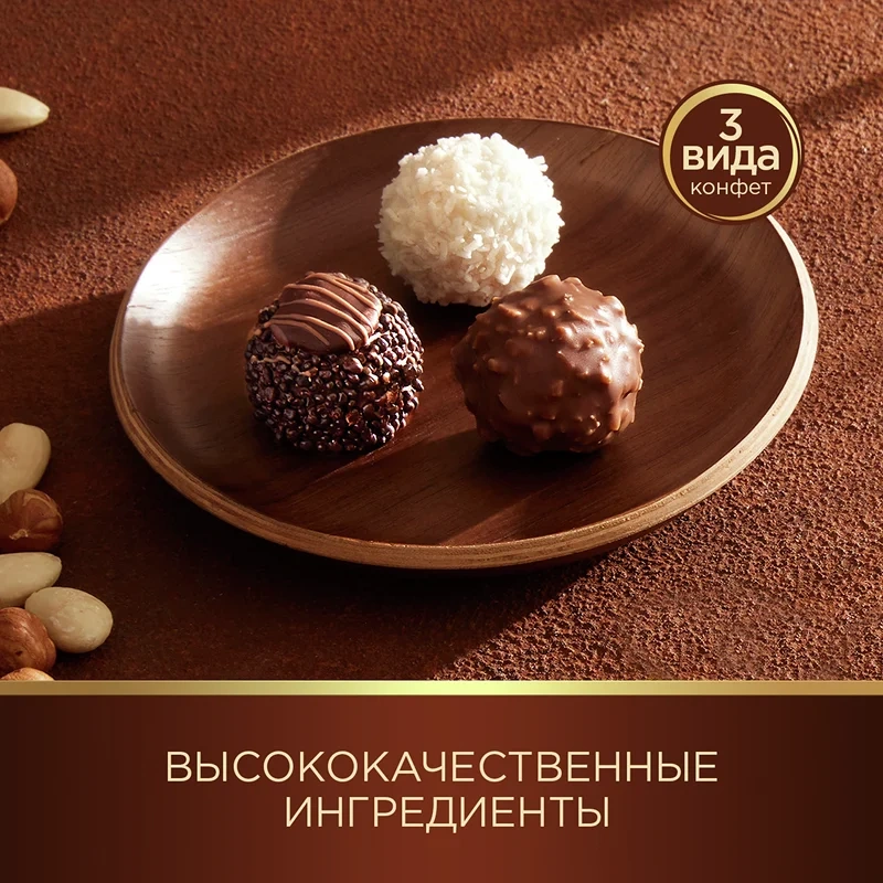 Rocher: сочетание цельного фундука, покрытого восхитительным сливочно-ореховым кремом, и хрустящей вафельной оболочки с шоколадом подарит вам неповторимые вкусовые ощущения.