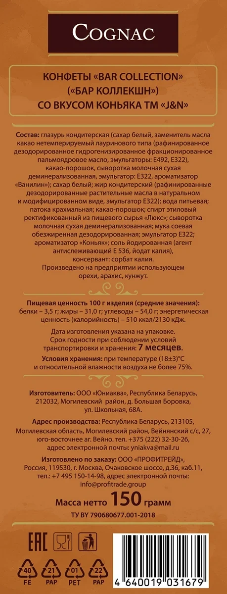 Можно ли наслаждаться коньяком без вреда для здоровья? У J&N есть решение - попробуйте великолепное сочетание коньячного вкуса с изысканной глазурью. Конфеты со вкусом коньяка в стилизованной упаковке подойдут для подарка и просто для хорошего настроения. Оригинальные кондитерские изделия никого не оставят равнодушным и подарят отличное настроение. Восхитительный вариант для поздравления по любому поводу.
