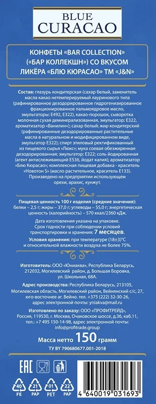 Конфеты J&N Bar Collection ликер блю кюрасао, 150г