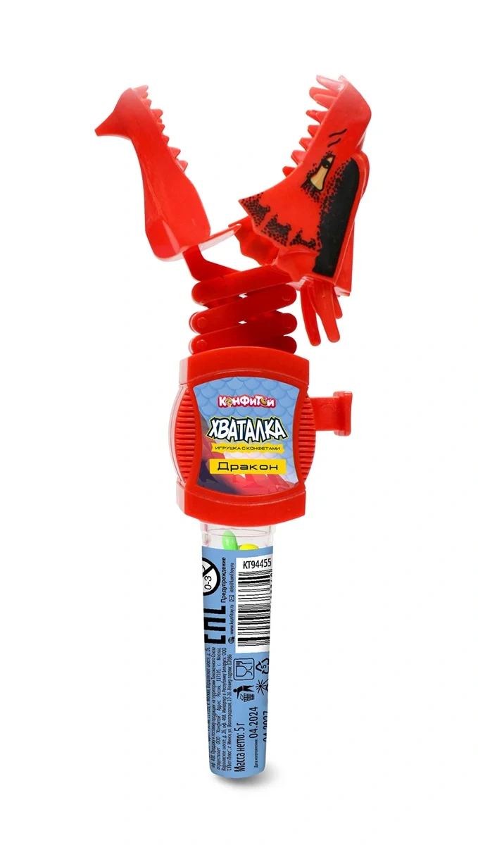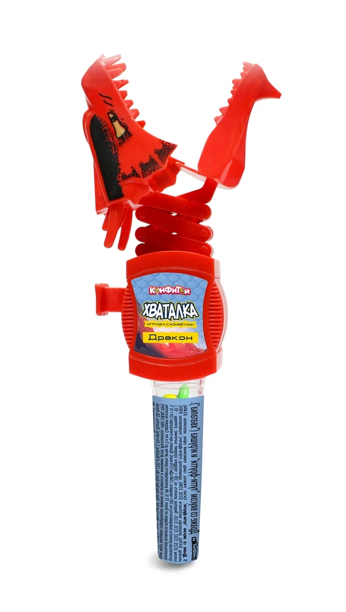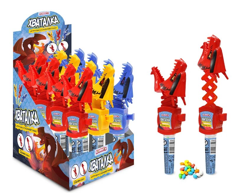 Конфеты Хваталка с игрушкой дракон, 5г x 12 шт - это яркая механическая игрушка в виде головы дракона. Если нажать на кнопку, то голова дракона выдвинется вперед на 5см, а его зубастая пасть захлопнется. С помощью этой игрушки можно схватить небольшие предметы, что особенно будет интересно маленьким детям. Внизу игрушки имеется специальный отсек, в котором насыпаны яркие фруктовые конфетки-драже.