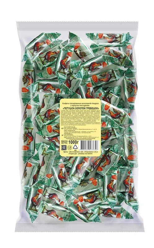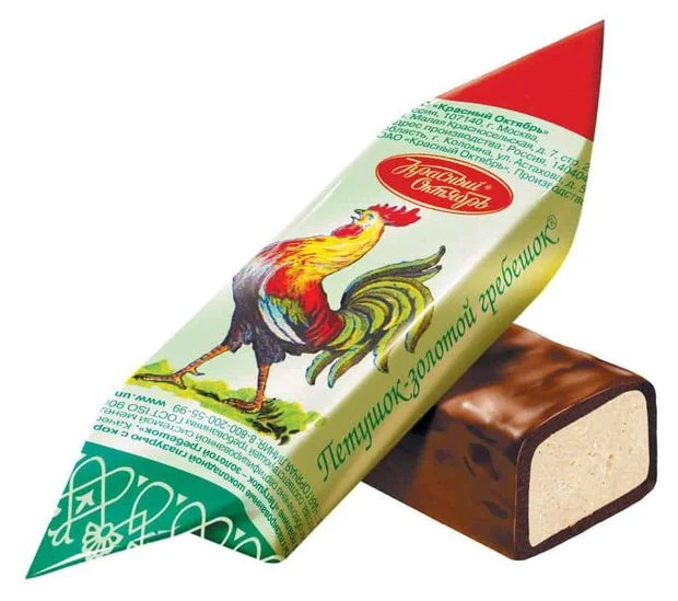 Нарядные праздничные конфеты Петушок Золотой Гребешок от фабрики Красный Октябрь. Плотное светлое пралине с пряным апельсиновым ароматом, покрытое слоем темной шоколадной глазури. Многогранный вкус нежного пралине изысканно сочетается с терпковатым вкусом шоколадной глазури. Конфеты хороши как с чаем, так и с кофе.