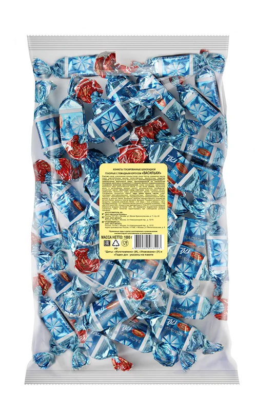 Конфеты Васильки в шоколадной глазури: воздушная тающая помадка со вкусом крем-брюле, обогащенная тертыми орешками кешью и коньяком. Мягкий бархатистый вкус с особой сладостью орехов кешью и легкие ромовые нотки, которые оттеняет вкус шоколада и яркая, знакомая с детства синева блестящих фантиков – вот такие у фабрики Рот Фронт Васильки.