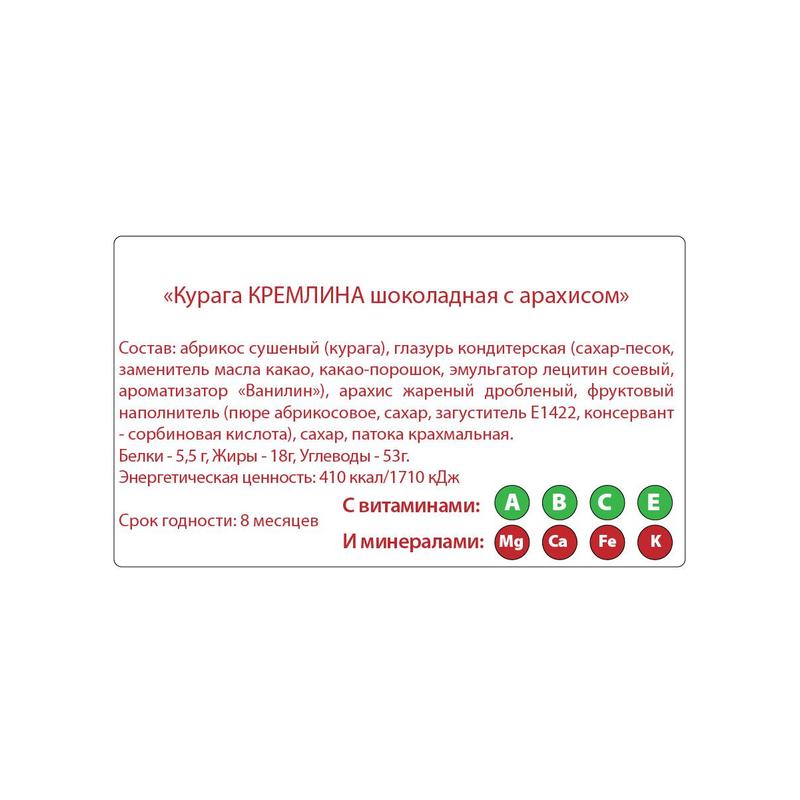Кремлина «Курага с арахисом» — идеальное дополнение к праздничному сладкому столу, а также замечательный выбор для сопровождения подарочных корзин с вином, чаем или другими кондитерскими изделиями.
