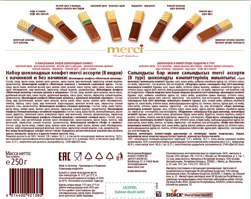 Сахар, масло какао, молотый лесной орех, молоко сухое цельное, какао тертое, пахта сухая, лактоза, молоко сухое обезжиренное, жир молочный, эмульгатор соевый лецитин, ароматизаторы; сахар, молоко сухое цельное, масло какао, дробленый лесной орех, какао тертое, дробленый миндаль, пахта сухая, лактоза, эмульгатор соевый лецитин, ароматизатор; сахар, жир растительный, молоко сухое цельное, масло какао, какао тертое, молоко сухое обезжиренное, глюкоза, лактоза, пахта сухая, жир молочный, какао-порошок, молотый лесной орех, эмульгатор соевый лецитин, соль, ароматизатор; сахар, какао тертое, масло какао, сливки сухие, молоко сухое цельное, эмульгатор соевый лецитин, ароматизатор; сахар, какао тертое, молотый миндаль, масло какао, фруктоза, глюкозный сироп, инвертный сироп, жир молочный, глюкоза, ароматизаторы, эмульгатор соевый лецитин; сахар, какао тертое, жир растительный, молоко сухое обезжиренное, какао-порошок, масло какао, лактоза, жир молочный, эмульгатор соевый лецитин, ароматизатор; сахар, масло какао, сливки сухие, молоко сухое цельное, какао тертое, молоко сухое обезжиренное, лактоза, кофе натуральный жареный молотый, пахта сухая, эмульгатор соевый лецитин, соль, ароматизатор.