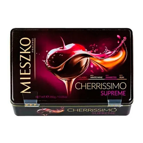 Конфеты Mieszko Cherrissimo Supreme вишня в алкоголе - набор шоколадных конфет Вишня в алкоголе - это шикарная жестяная коробочка для особых торжественных случаев.