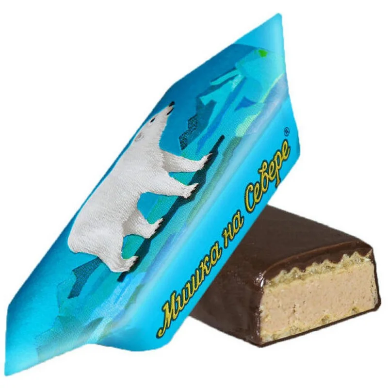 Конфеты Мишка на севере торгового бренда Фабрика имени Крупской - это глазированная сладость с начинкой на основе растертых с сахаром ядер миндаля между хрустящими вафельками. Они станут хорошим дополнением любого чаепития.