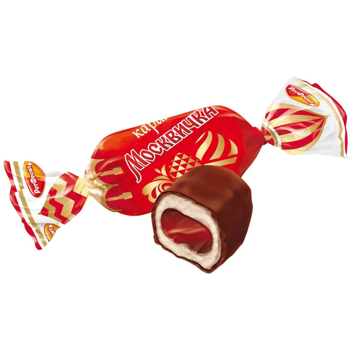 Легендарная конфета 'Москвичка' фабрики 'Рот Фронт' – это хрустящая белая карамель, покрытая шоколадной глазурью. Внутри конфеты – нежная помадная начинка с добавлением какао, сгущенного молока и терпким коньячным ароматом. Вкус, знакомый многим поколениям, сочетание твердой карамели и тающей мягкой начинки.