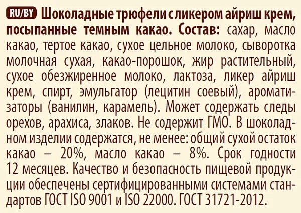 Созданы по традиционному рецепту. Нежное сердце из сливок и шоколада усыпано ароматным темным какао. Трюфель – это шоколадный король, премиальный продукт с богатой историей, восходящей к французскому кондитеру Н. Петруччелли, который придумал этот оригинальный шоколадный рецепт в 1895 году. Эти конфеты обладают удивительной способностью мгновенно создавать вокруг себя атмосферу праздника.