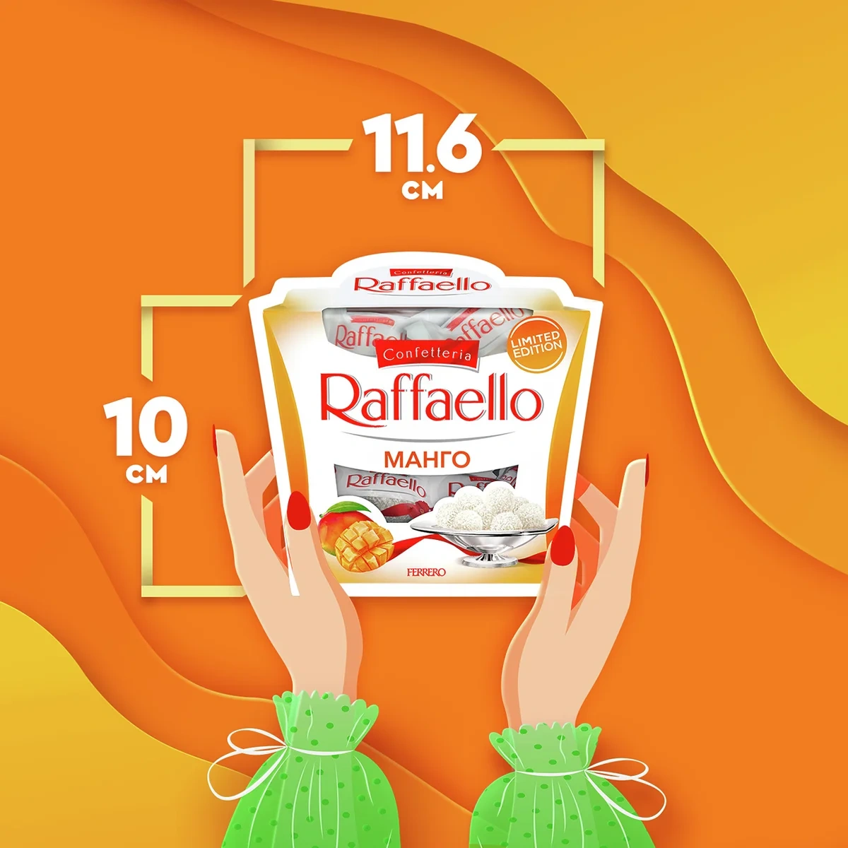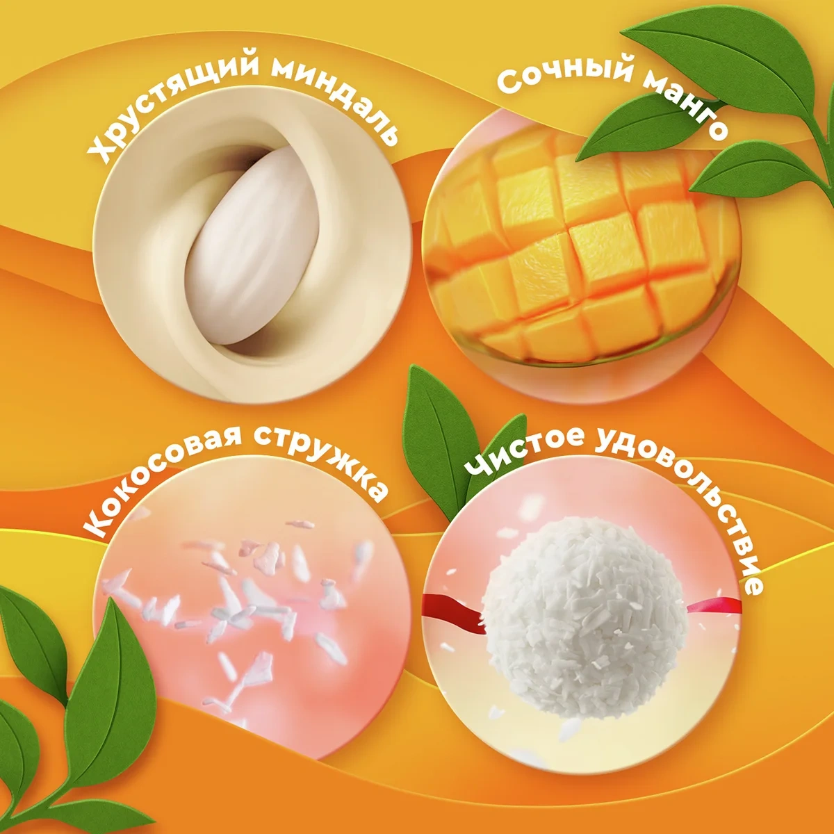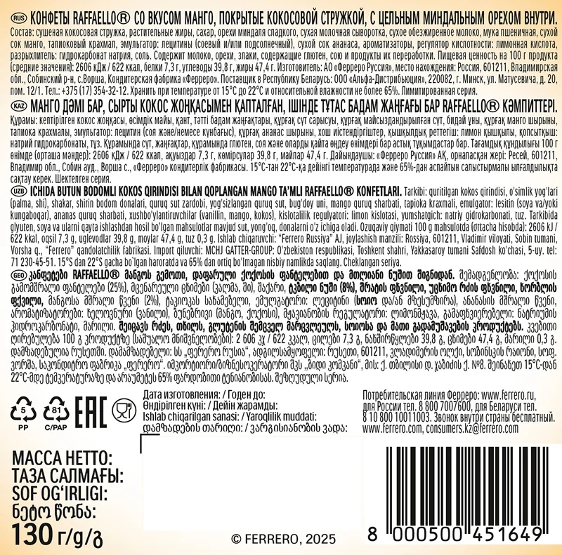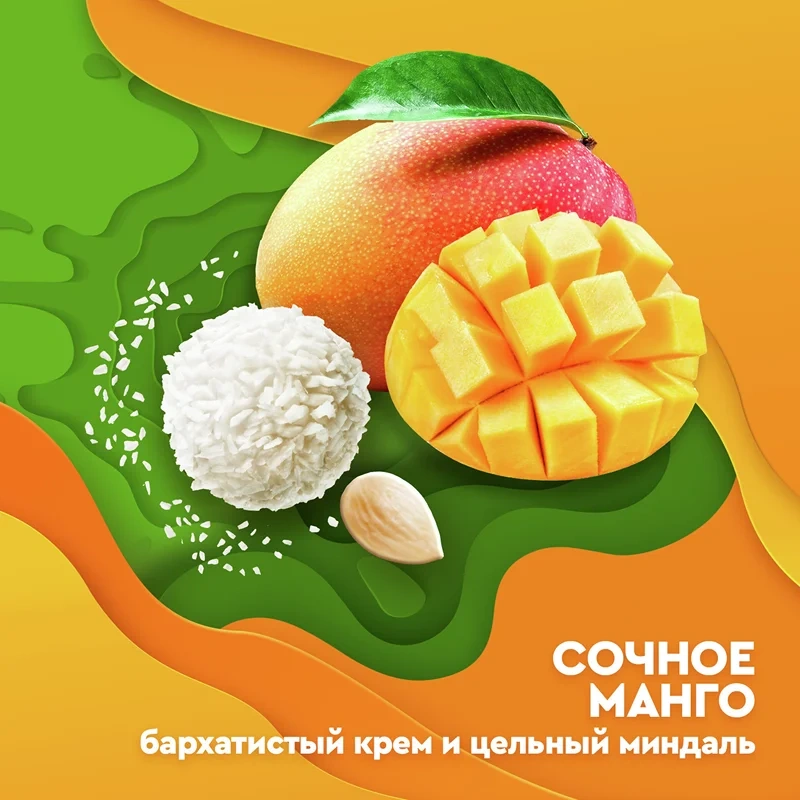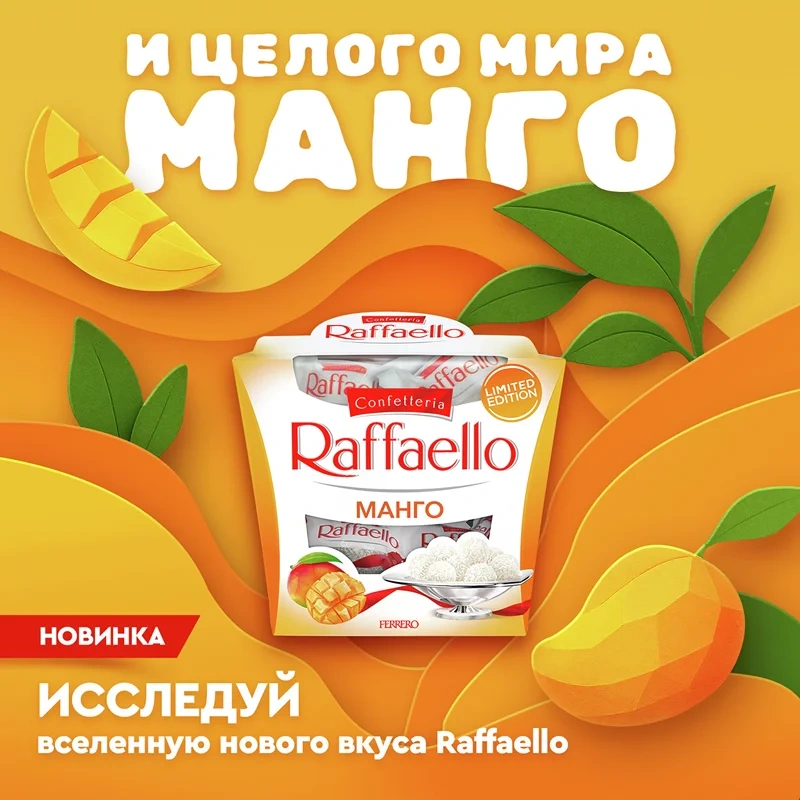 Встречайте неповторимое сочетание классического вкуса Raffaello и манго. Используются ингредиенты высочайшего качества.