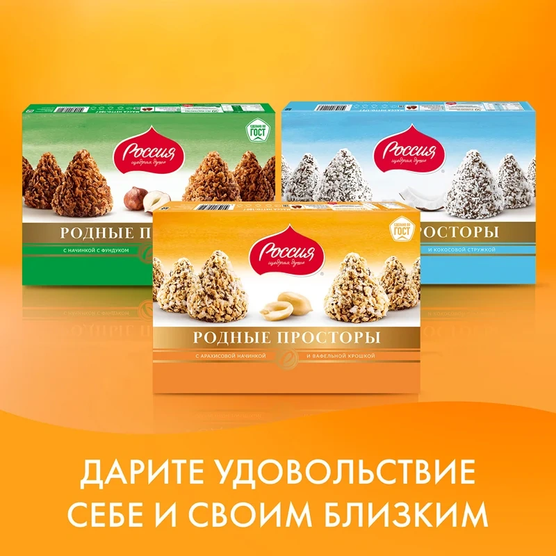 Конфеты Родные Просторы с нежной начинкой с арахисом, покрытые шоколадной глазурью и хрустящей вафельной крошкой произведены по высоким стандартам качества ГОСТ. Лимитированный дизайн упаковки станет украшением любого торжества. Дарите удовольствие себе и своим близким!