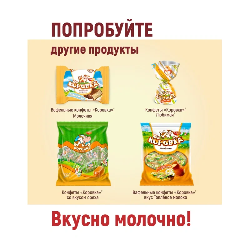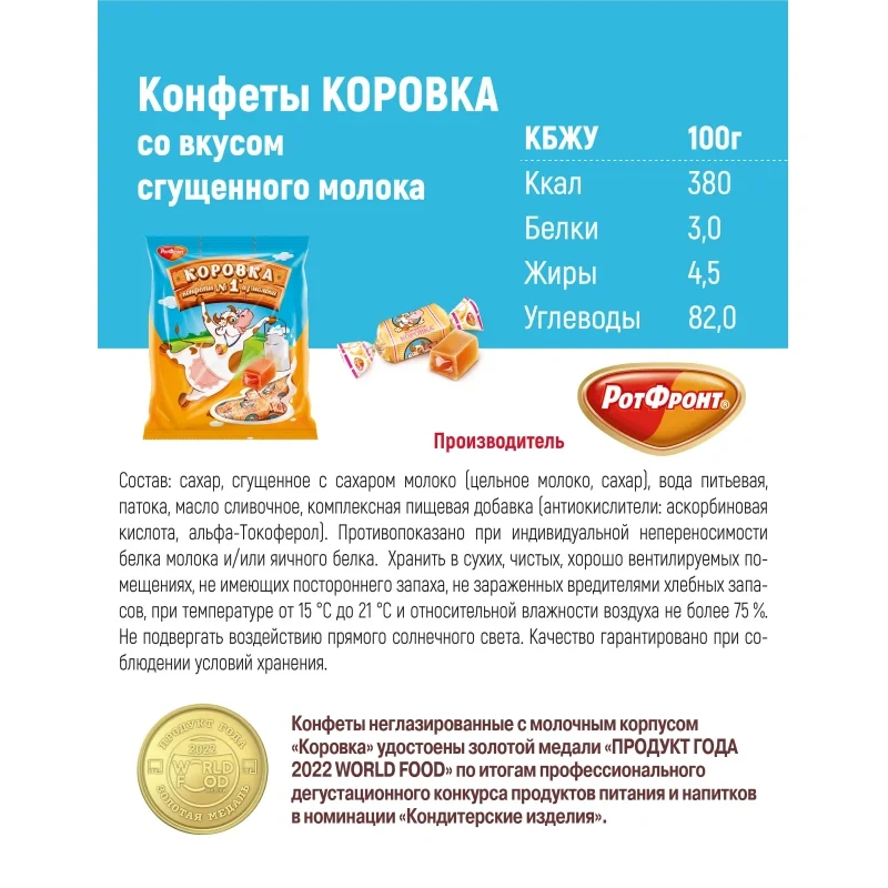 Конфеты Рот Фронт Коровка молочные, 180г представляет собой оригинальный десерт, который может стать идеальным дополнением к повседневному или праздничному столу. Он отличается насыщенным, сливочным вкусом и приятным ароматом, который может прийтись по душе всем членам семьи. В состав входят натуральные ингредиенты высокого качества. Лакомство подарит родным и близким позитивное настроение и улыбки, утолит голод, придаст сил и зарядит энергией на весь день. Конфеты идеально сочетаются с чашкой горячего кофе, чая или какао. Они станут особой изюминкой во время чаепития в кругу друзей. Рекомендуется хранить вдали от источников тепла, прямых солнечных лучей, при температуре от +3°C до +18°C. Вся необходимая информация размещена на этикетке с фирменным логотипом. Бренд «Рот Фронт» появился в 1826 г. Его история начинается с открытия предприимчивым мещанином Сергеем Леновым кондитерской мастерской в районе Замоскворечья. Сегодня это большая шоколадно-кондитерская фабрика, которая входит в холдинг «Объединенные кондитеры». Компания специализируется на производстве широкого ассортимент весовой и фасованной карамели, вафель, халвы, шоколадных изделий, конфет в коробках, мармелада, драже и некоторой другой продукции.
