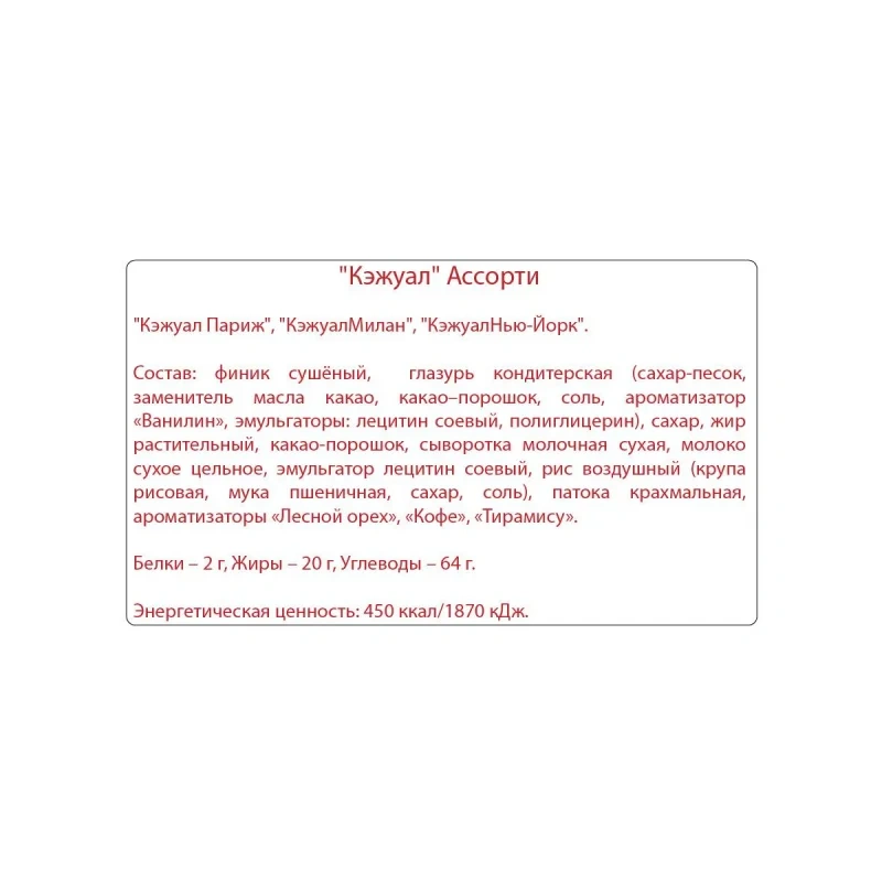 Конфеты шоколадные Кремлина 'Casual' ассорти 1 кг - великолепные конфеты с прекрасными названиями известных столиц - Милан и Париж. Вкуснейшая начинка на основе натурального финика с воздушным рисом в одном варианте, кремовая с воздушным рисом в другом, и толстый слой шоколадной глазури подарят незабываемое удовольствие и наслаждение всем поклонникам шоколадных десертов. Прекрасный дуэт конфет Кремлина 'Casual' украсит домашние и офисные чаепития, порадует гостей и поможет создать праздничную атмосферу в обычный день. Сладкое лакомство подарит заряд энергии и отличное настроение, а также вдохновит на достижение поставленных целей и активизирует работу головного мозга. Это отличный вариант для угощения коллег, друзей, родных и близких, которые непременно оценят ваш вкус и заботу. Ассорти шоколадных конфет станет удачным выбором для наполнения подарочных корзин, в качестве сопровождения чая и вина, а также для самостоятельного создания новогодних подарков для детей. Килограммовая упаковка - это много ярких и вкусных мгновений и не одна порция сладкого чаепития. Состав: финик сушеный, глазурь кондитерская, крошка карамельная, рис воздушный, начинка кремовая на жировой основе, патока крахмальная, ароматизаторы 'Лесной орех', 'Ванильные сливки'. Натуральный продукт. Без ГМО, без искусственных красителей. Не содержит пальмовое масло. Вес: 1000 грамм Тип упаковки: картонная коробка Страна производства: Россия Срок хранения: 10 месяцев