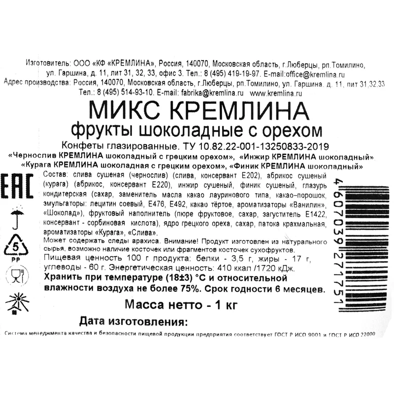 Конфеты шоколадные Кремлина Микс с фруктами и орехами, 1кг
