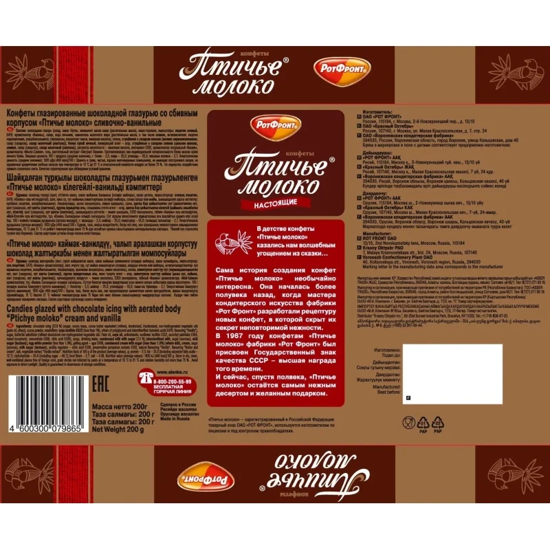 Конфеты шоколадные РОТ ФРОНТ 'Птичье молоко', сливочно-ванильные, 200 г, РФ09760