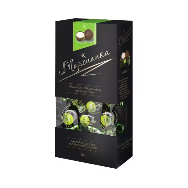 Конфеты Марсианка 'Чизкейк' - многослойное сочетание модных вкусов. Шоколадная глазурь, сладкая корочка, нежная начинка со вкусом чизкейка и хрустящее ядро. Вес - 200 г. Состав: сахар, жиры растительные, сыворотка молочная сухая деминерализованная, какао-порошок, рис воздушный с какао (крупа рисовая, сахар, мука пшеничная, какао-порошок, соль), патока, эмульгаторы: лецитин соевый, Е492; стабилизатор гуммиарабик, ароматизаторы. Пищевая ценность 100 г продукта (среднее значение): белки - 2,5 г, жиры - 38 г, углеводы - 55 г. Энергетическая ценность 100 г продукта (среднее значение): 2390 кДж / 570 ккал. Срок годности: 9 месяцев. Условия хранения: хранить при температуре 18(+3)C и относительной влажности воздуха не более 75%. Производитель: ООО 'Сладкий Орешек'. Страна производства: Россия.