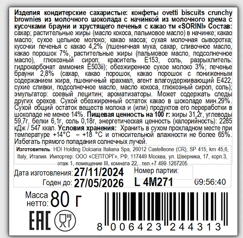 Конфеты Sorini в молочном шоколаде с хрустящим печеньем и брауни, 80г