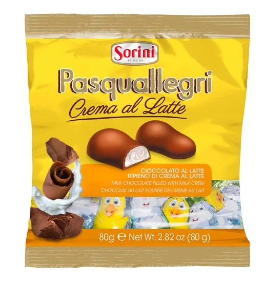 Паскуаллегри - это забавные молочные шоколадные конфеты с начинкой из молочного крема в форме птенцов. Яркий пакетик с шоколадными фигурками станет отличным дополнением к пасхальному подарку.