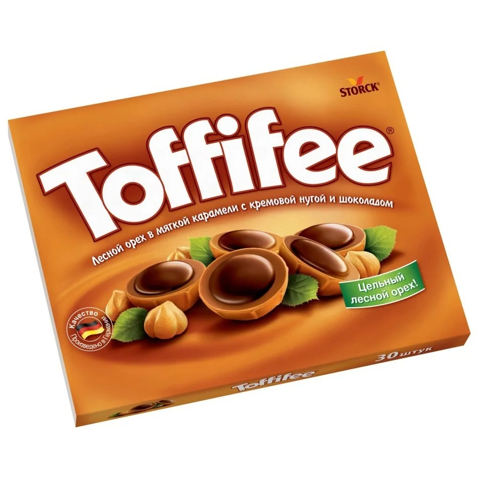 Конфеты Toffifee 250 г. Toffifee - шоколадные конфеты с темным шоколадом и начинками. Они содержат лесной орех в мягкой карамели, наполненной кремовой нугой. Идеальны для семейного чаепития или в качестве сладкого перекуса. Состав конфет включает: сахар, растительные жиры (пальмовый, дерева ши), цельные лесные орехи, сироп глюкозы, сухую молочную сыворотку, влагоудерживающий агент (сорбитовый сироп), какао тертое, сгущенное молоко, концентрированную молочную сыворотку, лактозу, какао-порошок, какао-масло, молочный жир, обезжиренное сухое молоко, сироп из тростникового сахара, эмульгатор (соевый лецитин), соль и ароматизатор (ванилин). Содержит 10% лесного ореха, 41% карамельной чашечки, 37% нуги и 12% шоколада. Продукт также может содержать незначительное количество миндаля, арахиса и других видов орехов. Пищевая ценность: белки - 6 г, жиры - 28,8 г, углеводы - 59 г. Энергетическая ценность: 552 ккал, 2183 кДж. Срок годности: 10 месяцев. Конфеты подходят для детей от 3-х лет. Хранить в сухом прохладном месте при температуре от 13C до 21C и относительной влажности воздуха от 40% до 65%. Внешний вид и/или характеристики товара могут быть изменены производителем в соответствии с производственным процессом.