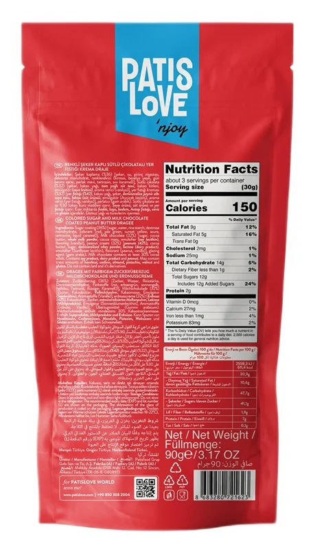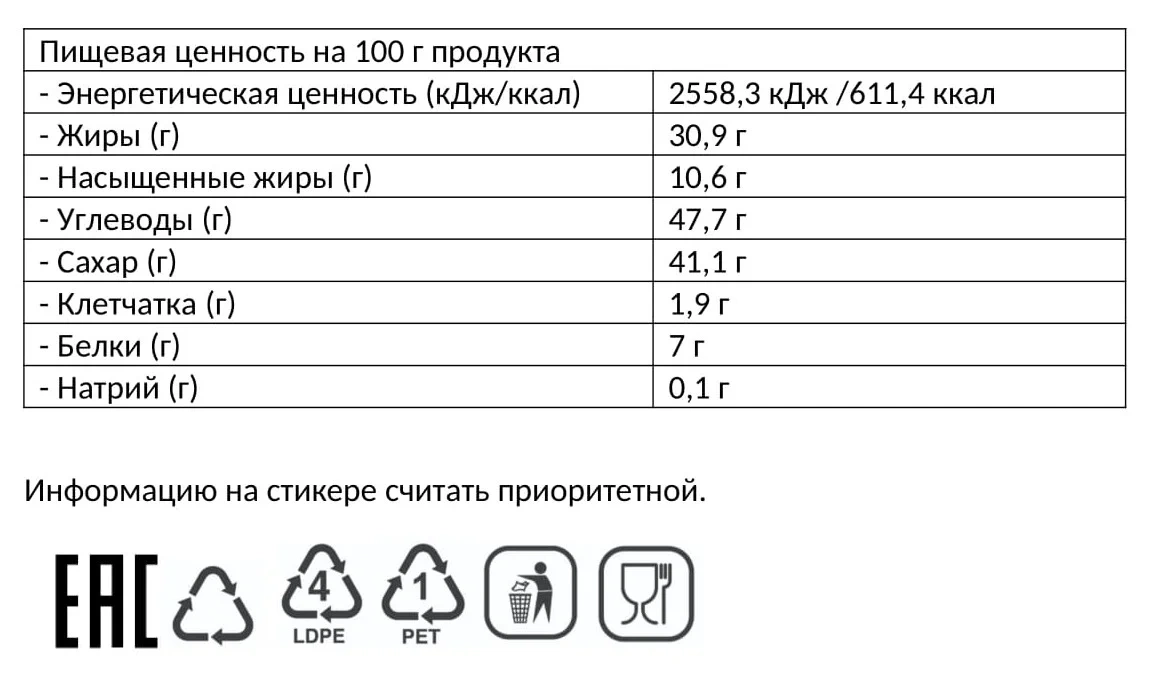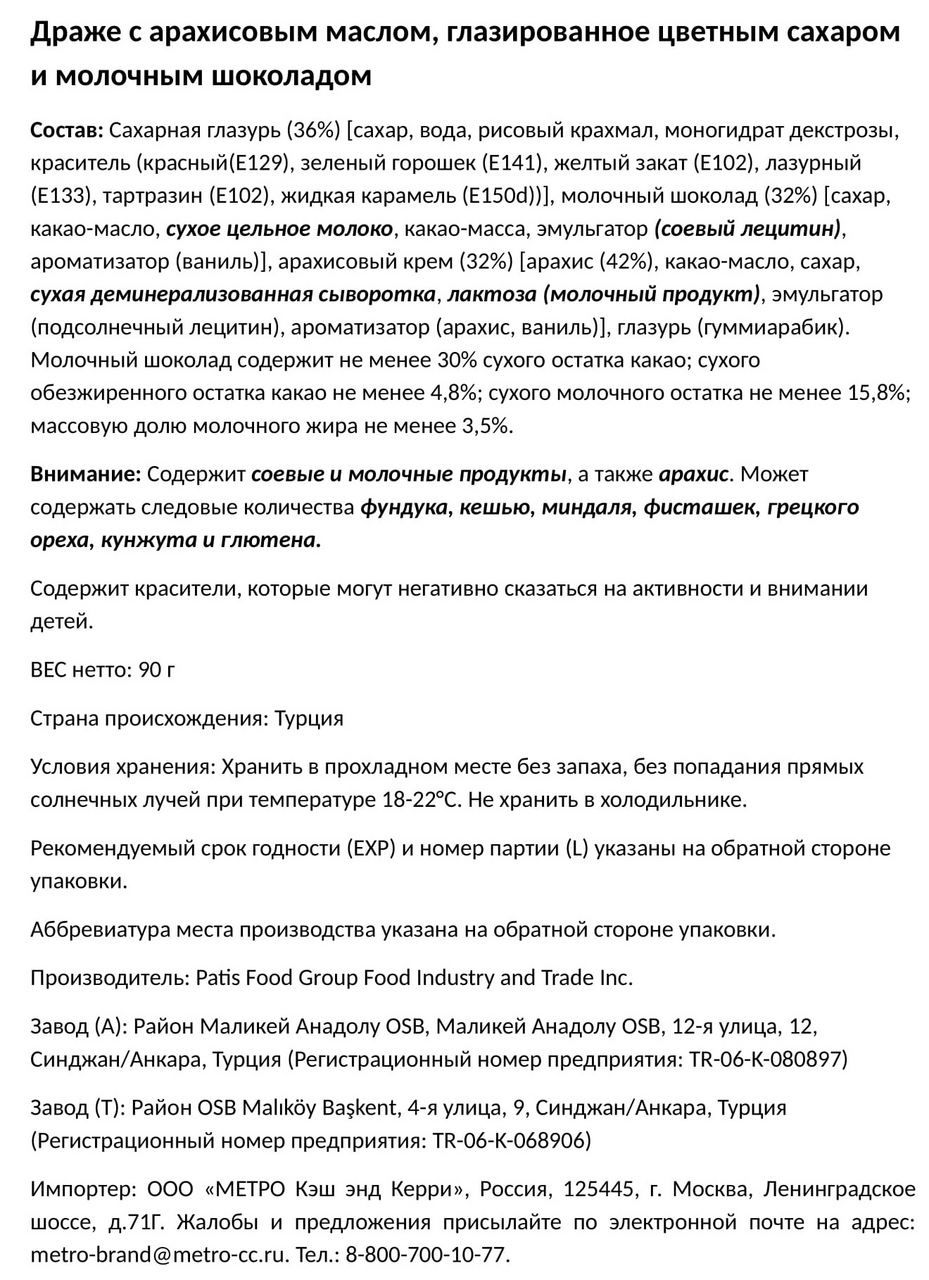 Сахар, тертое какао, какао-масло, сухое молоко, пастеризованное молоко, сливочное масло, растительный жир (пальмовое масло), загуститель гуммиарабик, эмульгатор соевый лецитин, мальтодекстрин, ароматизаторы: вишня, апельсин, кокос, фундук, карамель, малина.