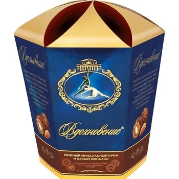 Начните день с шоколадных конфет Вдохновение с Миндалем и Ваши дела пойдут как по маслу, без нервов и стрессов. Шоколадные конфеты внесут в вашу жизнь настоящие вдохновение для новых свершений. Подкрепят организм гемоглобином и зарядят Вас отличным настроением. Начинка миндаля придает пикантный вкус, отличающий от привычных конфет с орехом и изюмом. Сделайте свою жизнь необычной – съешьте шоколадные конфеты Вдохновение с Миндалем. Стильная упаковка товара позволяет использовать его как подарок и как дополнение к цветам в праздники и будничные дни, которые Вы захотите сделать яркими.