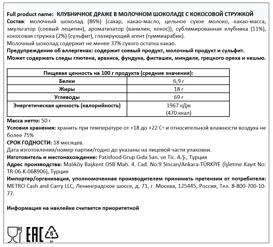 Сахар, растительные жиры кокосовое масло, пальмоядровое масло, какао-масса, сухое цельное молоко, какао-масло, сухая молочная сыворотка, сухое обезжиренное молоко, лактоза, обезвоженное масло сливочное из коровьего молока, экстракт ячменного солода, эмульгатор: соевый лецитин, ароматизатор пищевой.