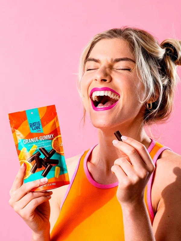Изысканное лакомство, сочетающее в себе жевательные конфеты с настоящим апельсиновым пюре и насыщенный темный шоколад, содержащий не менее 43% какао. Каждый кусочек дарит идеальную гармонию фруктовой сладости и изысканной горчинки, создавая сбалансированный и запоминающийся вкус.