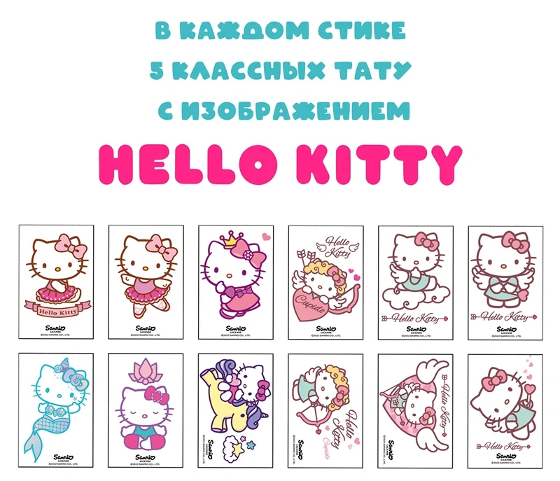 В каждом стике - 5 конфет и 5 переводных изображений Hello Kitty. Всего в коллекции 12 тату.