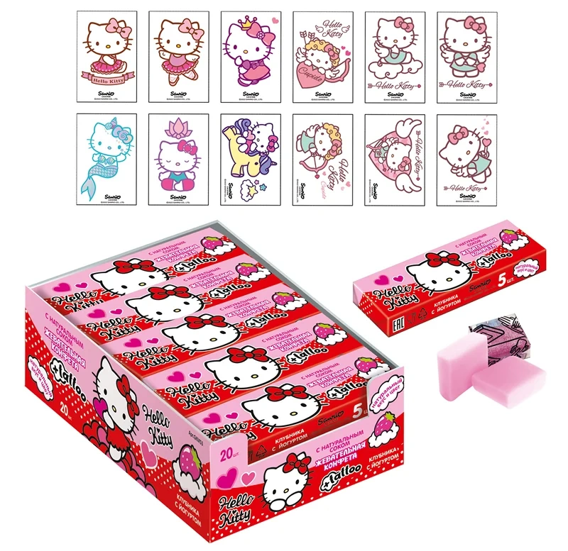 Конфеты жевательные Hello Kitty клубника и йогурт, 25 г x 20 шт - жевательная конфета со вкусом клубники с йогуртом и переводными изображениями (тату) Hello Kitty.