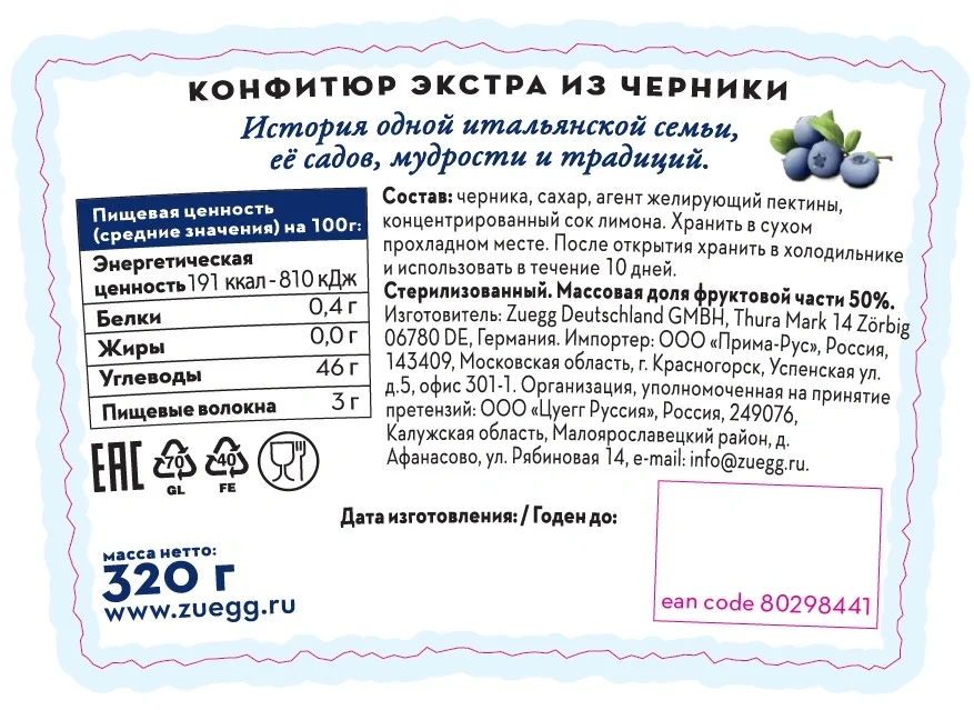 Низкокалорийные конфитюры Zuegg содержат высокий процент фруктов и ягод (60%), которые тщательно отбираются и собираются вручную в момент достижения ими нужной степени созревания. Основным отличием от традиционных конфитюров является отсутствие добавленных сахаров и пониженная калорийность. Такой продукт подходит для сбалансированного и здорового питания.