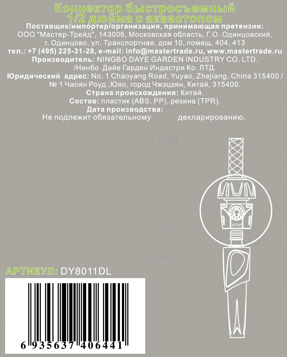 Коннектор быстросъемный 1/2 дюйма с аквастопом изготовлен из РР - полипропилен + АБС-пластик - ударопрочная техническая термопластическая смола на основе сополимера акрилонитрила с бутадиеном и стиролом + TPR или термопластичная резина.