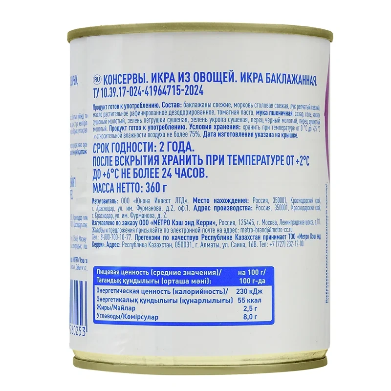 Икра из баклажанов стерилизованная, 360 г - вкусное готовое блюдо с добавлением специй, моркови и лу...