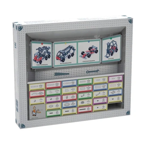 Модели в данном наборе объединяет тема колесных транспортных средств специального назначения: пожарная машина, бетономешалка, гоночная машина, погрузчик.