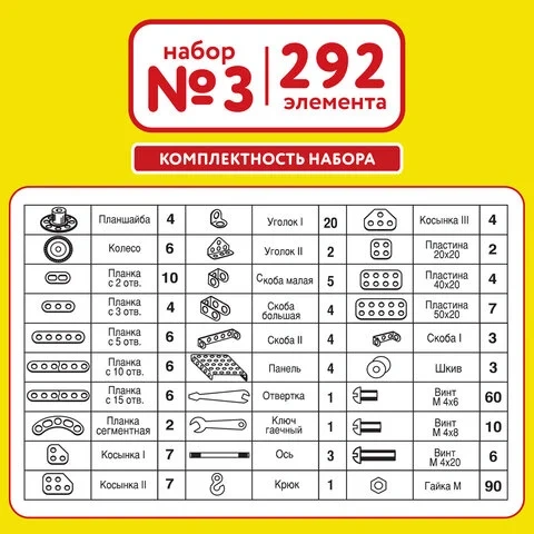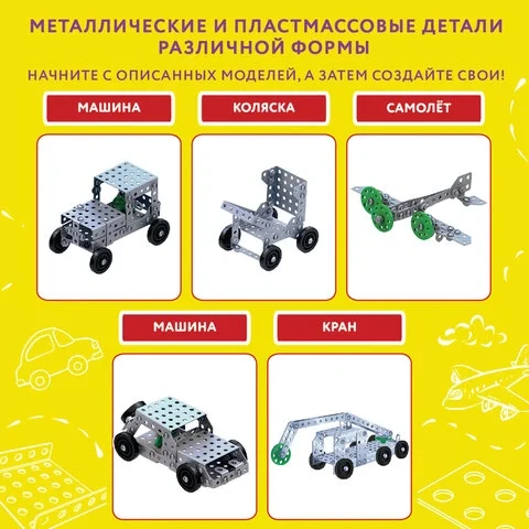 В комплект входят 292 элемента, среди которых есть подвижные детали, позволяющие собрать бесчисленное количество моделей. Для удобства в набор входит подробная иллюстрированная инструкция с пошаговыми рекомендациями по сборке 5 разных моделей, которая познакомит начинающего мастера с азами сборки. Начальный уровень сложности сборки предусмотрен для детей младшего и среднего школьного возраста. Элементы конструктора выполнены из металла и пластика. Также в набор входят пластиковые детали.