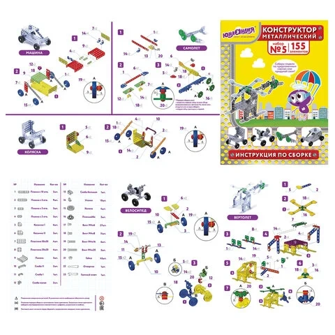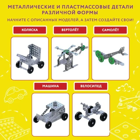 Вес товара - 430 г вместе с упаковкой, в комплект входит 155 элементов. Большая часть деталей изготовлена из металла, но есть и дополнительные элементы из пластика (например, миниатюрные колеса). Каждый набор укомплектован специальной отверткой и гаечным ключом. Предусмотрена инструкция, в которой подробно описаны и проиллюстрированы схемы сборки 5 моделей: вертолета, самолета, коляски, велосипеда и автомобиля. Можно собирать изделия по предложенным схемам или придумывать свои. Набор позволяет создавать разнообразные типы моделей, сформировать представление о строении различных типов транспортных средств и механизмов. Развивает мелкую моторику, усидчивость, логическое и абстрактное мышление.