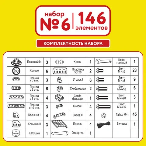 В набор входит 146 элементов, уровень сложности сборки - начальный. В комплектацию входит инструкция, в которой описан пошаговый алгоритм создания 5 моделей (подъемный кран, коляска, самолет, 2 вида автомобилей). Освоив азы работы с гайками, винтами, отверткой и гаечным ключом, можно смело приступать к созданию собственных схем сборки. Простор для фантазии безграничен: можно конструировать транспортные средства, всевозможные промышленные машины, мебель и т.д.