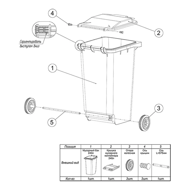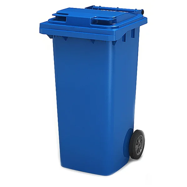 Бак для мусора 240л имеет крышку и два колеса, что облегчает обращение с ним и его передвижение. Он выпускается в четырех цветах (зеленом, желтом, синем и сером).