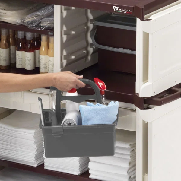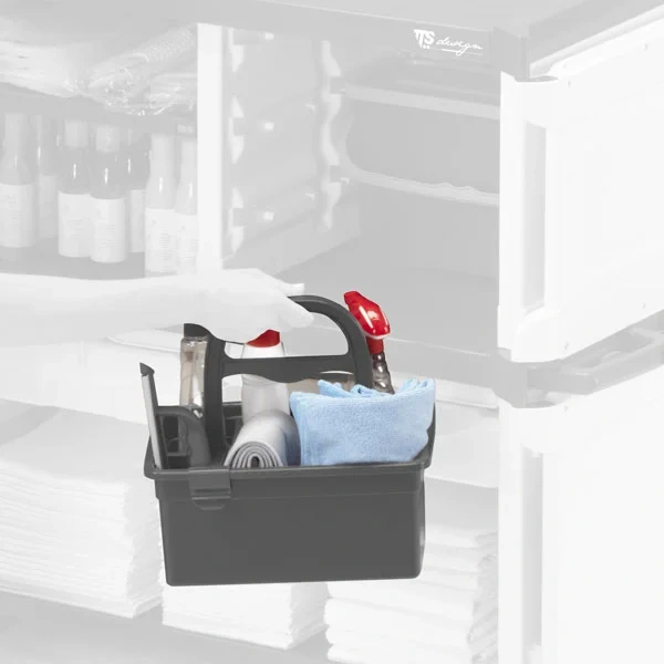 Контейнер предназначен для ношения пластиковых и стеклянных бутылок с моющими и дезодорирующими средствами. Он является рабочим инструментом сотрудника клининговой компании и используется в процессе уборки помещений.