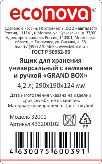 Контейнер для хранения Econova Grand Box голубой с крышкой 29 x 19 x 12.4, 4.2л