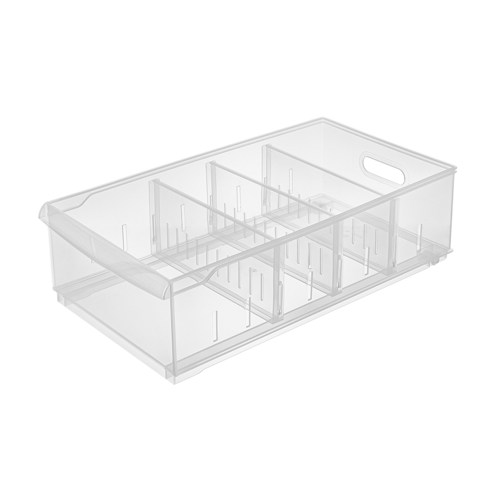 Контейнер универсальный подойдёт для хранения различных предметов (химии, кухонных предметов, одежды, игрушек). С помощью нескольких перегородок, которые идут в комплекте, и специальных пазов можно менять размер отделений контейнера по необходимости, приспособив как для мелочей, так и для крупных предметов. Прозрачные стенки позволяют видеть, что хранится внутри каждого из контейнеров. За счет высокой прочности прослужит долгое время. Контейнер имеет компактные размеры, поэтому не занимает много места.