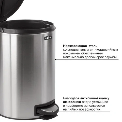 12 л - стандартный объем при средней проходимости. Оборудовано педалью для открывания. Крышка плотно прилегает, тем самым препятствуя распространению запахов. Внутреннее съемное пластиковое ведро имеет удобную рукоятку для извлечения. Изготовлено из нержавеющей стали с матовым покрытием. Ведро устойчиво благодаря антискользящему основанию. Объем рекомендуемого мешка - 20 л. Контейнер для мусора в стальном цвете с матовым покрытием имеет размеры (40х32,5х32,5 см) и отлично впишется в любой интерьер.