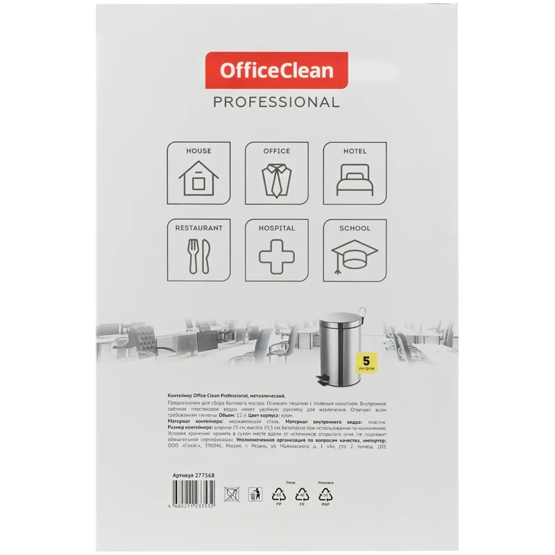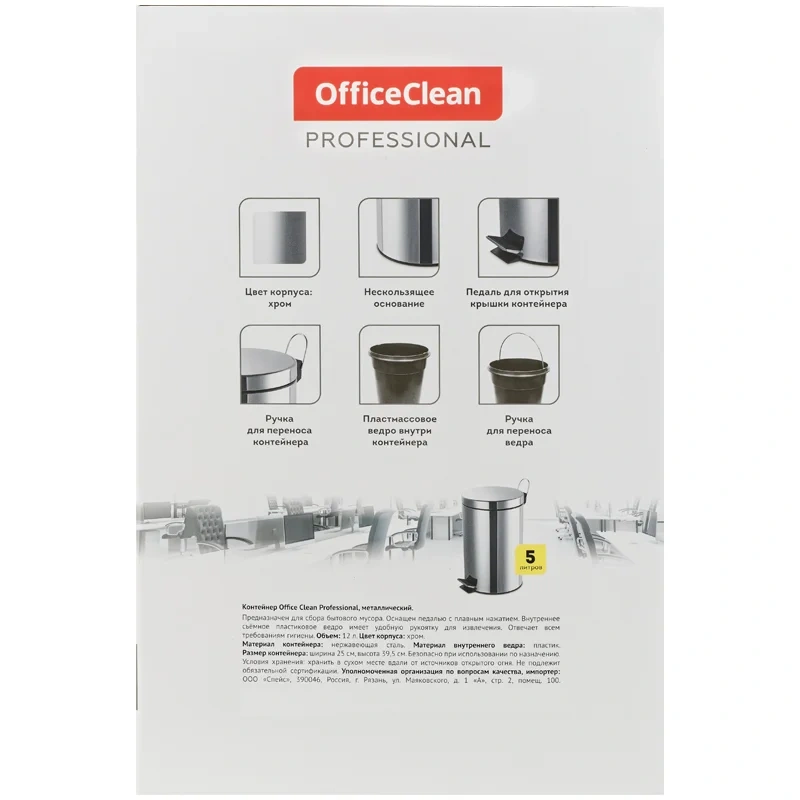 Предназначен для сбора бытового мусора. Оснащен педалью с плавным нажатием. Внутреннее съёмное пластиковое ведро имеет удобную рукоятку для извлечения. Отвечает всем требованиям гигиены. Рекомендуемый объем мешка 10л.