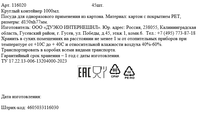Контейнер картонный 15 x 7.7см, 1л х 45шт