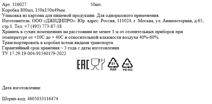 Контейнер картонный 20.9 x 12.7 x 5.5см, 800мл х 50шт