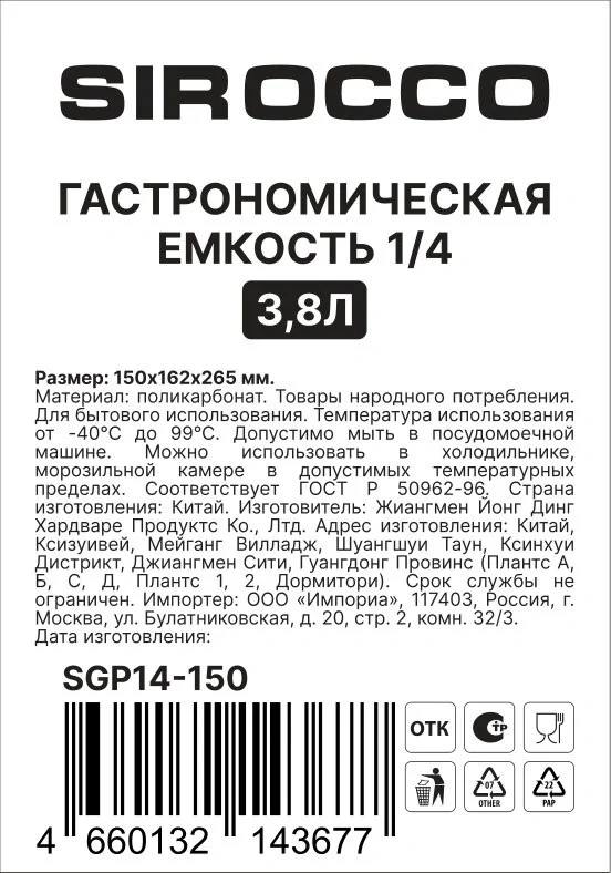 Гастроемкость поликарбонат 1/4 150мм, 3.8л