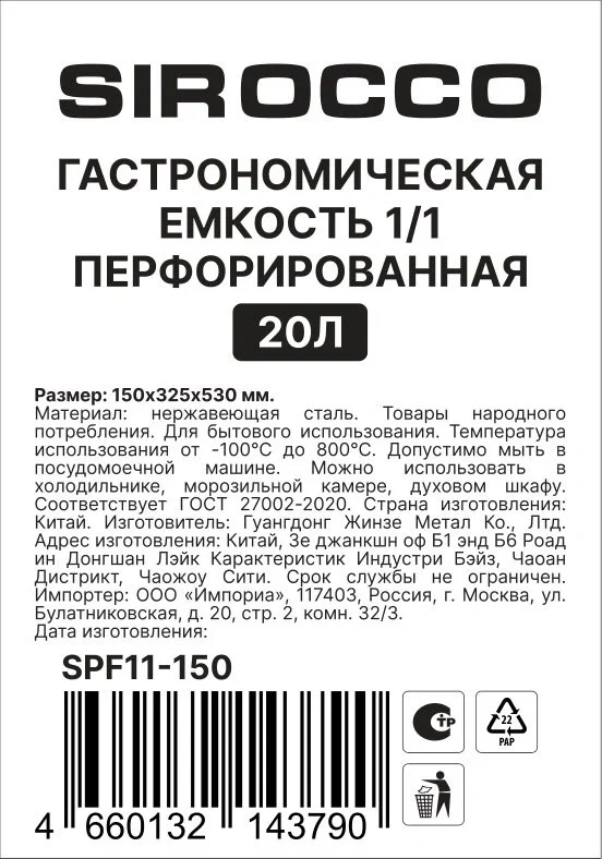 Гастроемкость перфорированная Sirocco 1/1, 150мм, 20л
