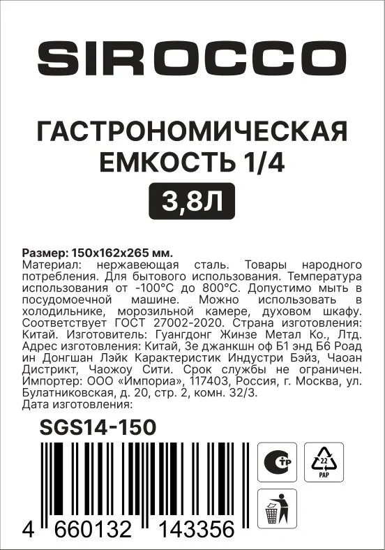 Гастроемкость нержавеющая сталь 1/4 150мм, 3.8л