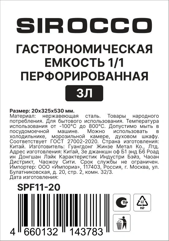Гастроемкость перфорированная Sirocco 1/1, 20мм, 3л